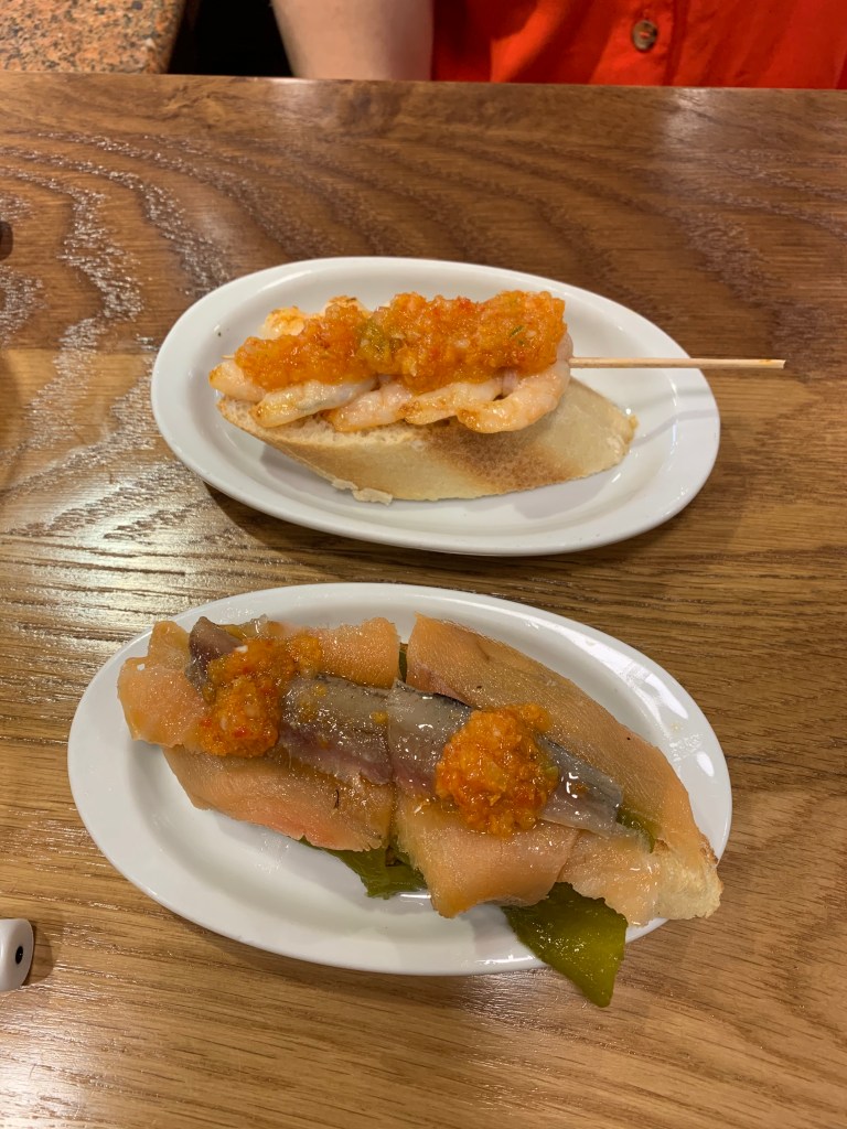 Mari Juli is a common Pintxo in Donostia and the best of the best you can find here at Goiz Argi. Their version is made with smoked salmon, preserved anchovy and green peper served on a piece of toasted bread and topped with their homemade vinaigrette. Goiz Argi is a small place but can be very busy. While you are there also try their prawn pintxo.