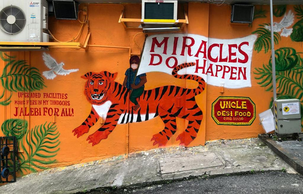 This spot is one of Hong Kongs most picturesque spots. This mural graffiti is one of Hong Kongs most photographable spots. The artist, Alex Croft, depicted old townhouses as a commissioned piece for the lifestyle brand G.O.D. around the corner. Now the mural painting has become a highlight on its own.