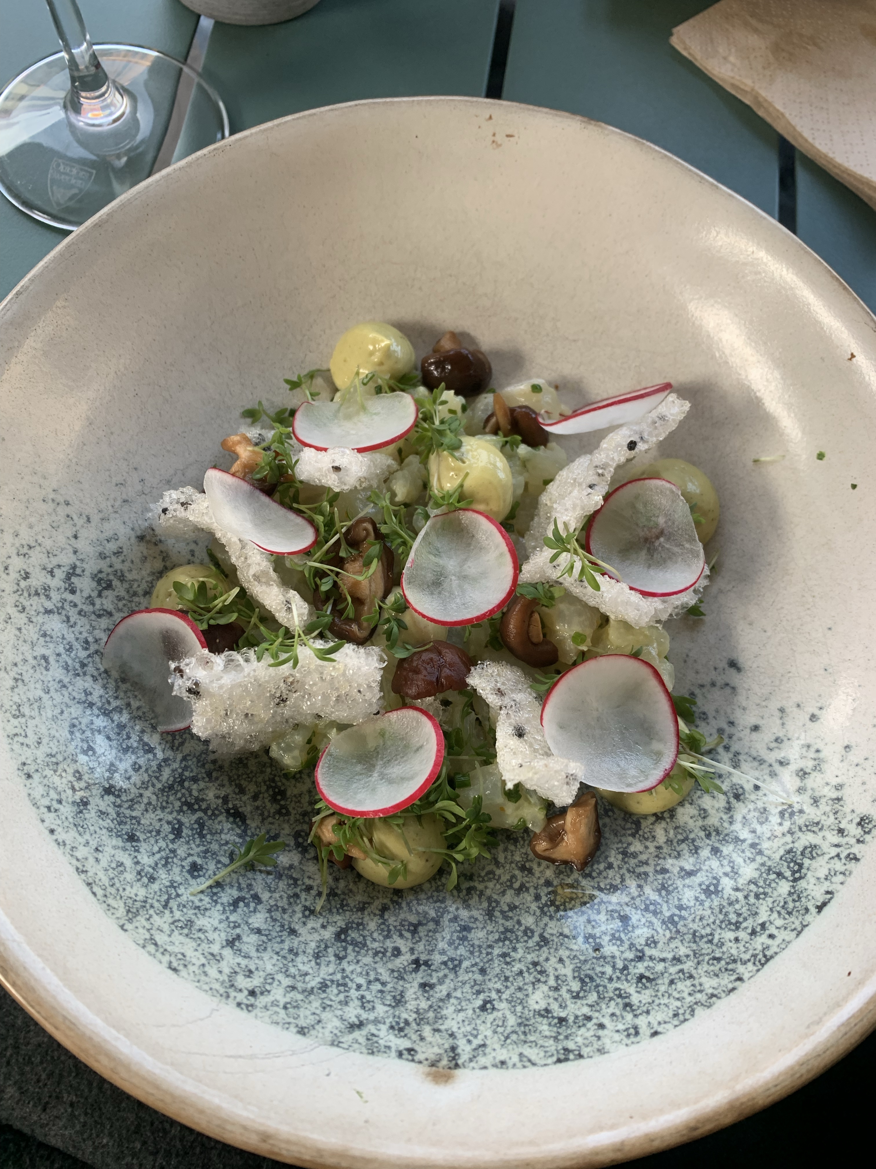 We kicked off our dining experience with olives and bread, a classic starter that set a promising tone. Moving on to the Scampi Diavola, we were enticed by the delicious sauce that paired heavenly with our bread. However, we were slightly disappointed with the overcooked and rubbery texture of the scampi. On a brighter note, the halibut tartar, a daily special, showcased the freshest halibut alongside a refreshing combination of avocado cream, shiitake, radish, crackers, and watercress. This well-balanced dish was perfect for enjoying an outdoor meal on a summer evening. As for the Arctic Char, it delighted our palates with its impeccably cooked fish, harmoniously complemented by a variety of asparagus, potatoes, a luscious browned butter sauce, and fish roe. Fiskbar17 remains one of our favorite destinations for high-quality fish and seafood in Gothenburg, despite the minor setback with the scampi.