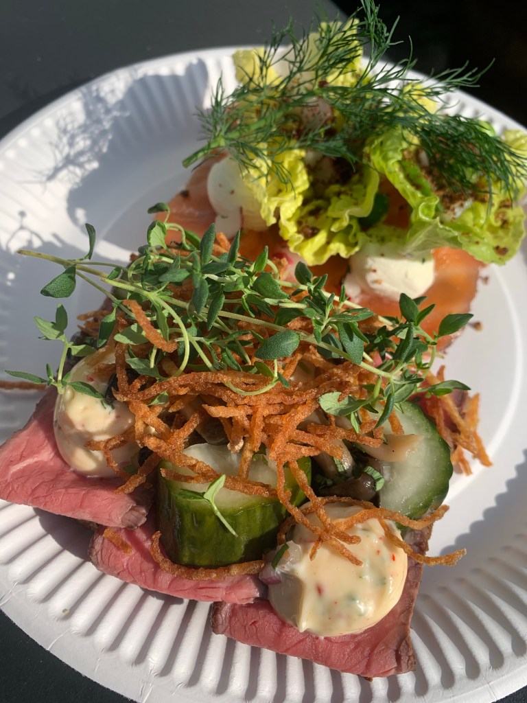 Experience the epitome of Smorrebrod indulgence at Copenhagen’s renowned Aamans Deli. Nestled among the city’s finest establishments, Aamans Deli has emerged as a coveted destination for enthusiasts of this traditional Danish delight. Despite our take-away circumstances during our recent visit, the symphony of flavors was in no way diminished. As we savored our selections outdoors, the Cold Smoked Salmon, artfully paired with chives mayo, apples, kohlrabi, pickled onions, frisee, and rye crumble (79 DK), delighted our taste buds. Equally impressive was the Roast Beef Smorrebrod, boasting Bearnaise sauce, pickled cucumber, mushrooms, crispy potatoes, and thyme (74 DK), a combination that left an indelible mark, particularly the classic Roast Beef variant. Our only regret was not partaking in a park picnic, an option that would have seamlessly elevated the experience, showcasing the flexibility of Aamans Deli’s offerings.