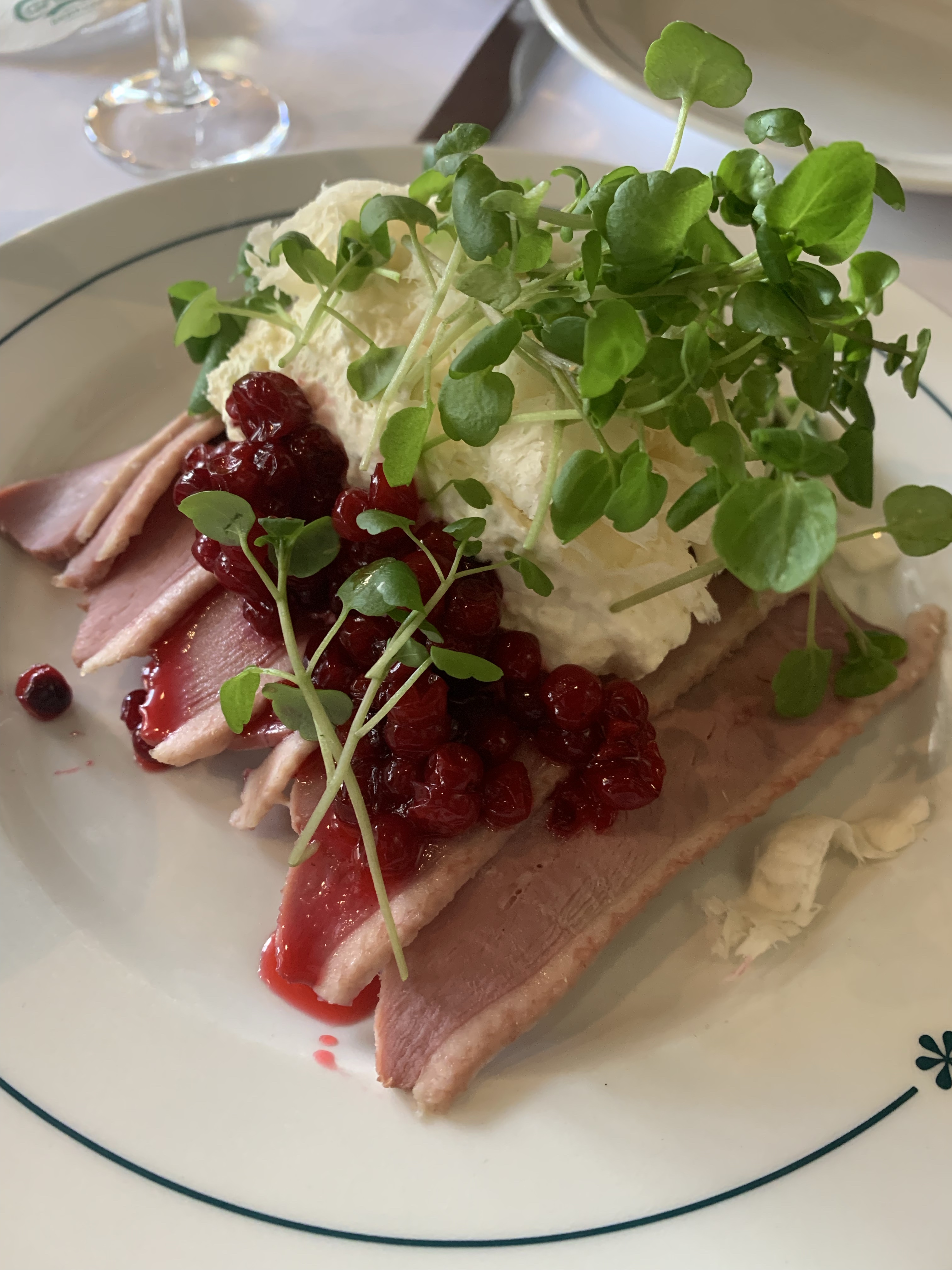 As our culinary exploration continued, we savored a final Smorrebrod creation: Boiled Salted Duck Breast with horseradish cream, lingonberry, and watercress. Our knowledgeable waiter shared that typically two Smorrebrod are recommended per person for a satisfying lunch; however, sharing these three exquisite creations between us proved to be more than ample.