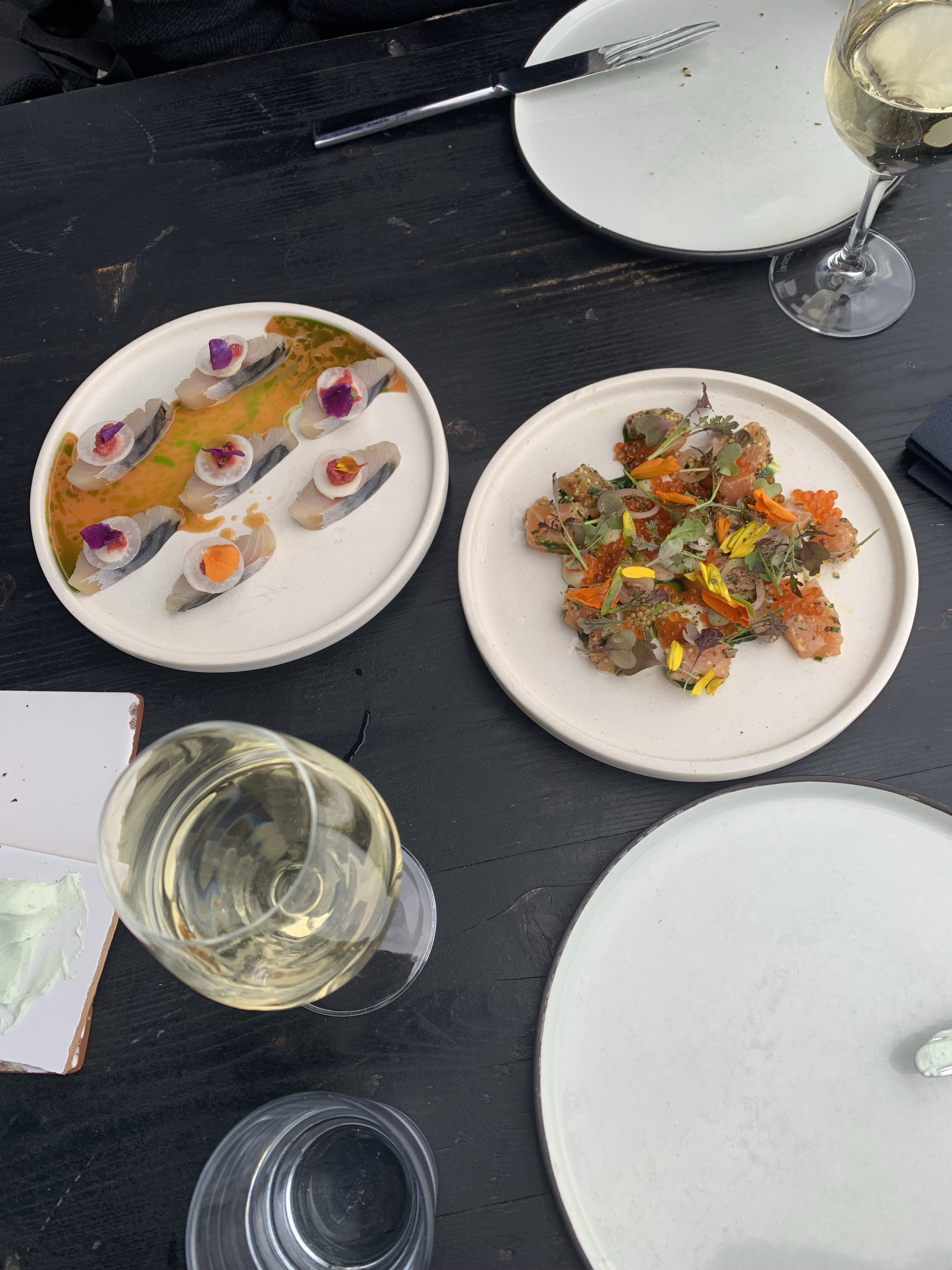 If you’re a seafood and fish enthusiast, Fiskebar in Copenhagen’s vibrant Kodbyens district is a must-visit destination. Our recent dining experience at Fiskebar left us in awe of their delectable offerings. With a reservation in hand and a desire to enjoy the outdoors, we opted for a cozy spot outside. Our culinary journey began with two delectable appetizers: the Salmon Tartare with a delightful blend of tarragon, mustard cress, and sesame (175 DK), and the Danish Mackerel paired harmoniously with grilled raspberries, roses, and tomato (165 DK).