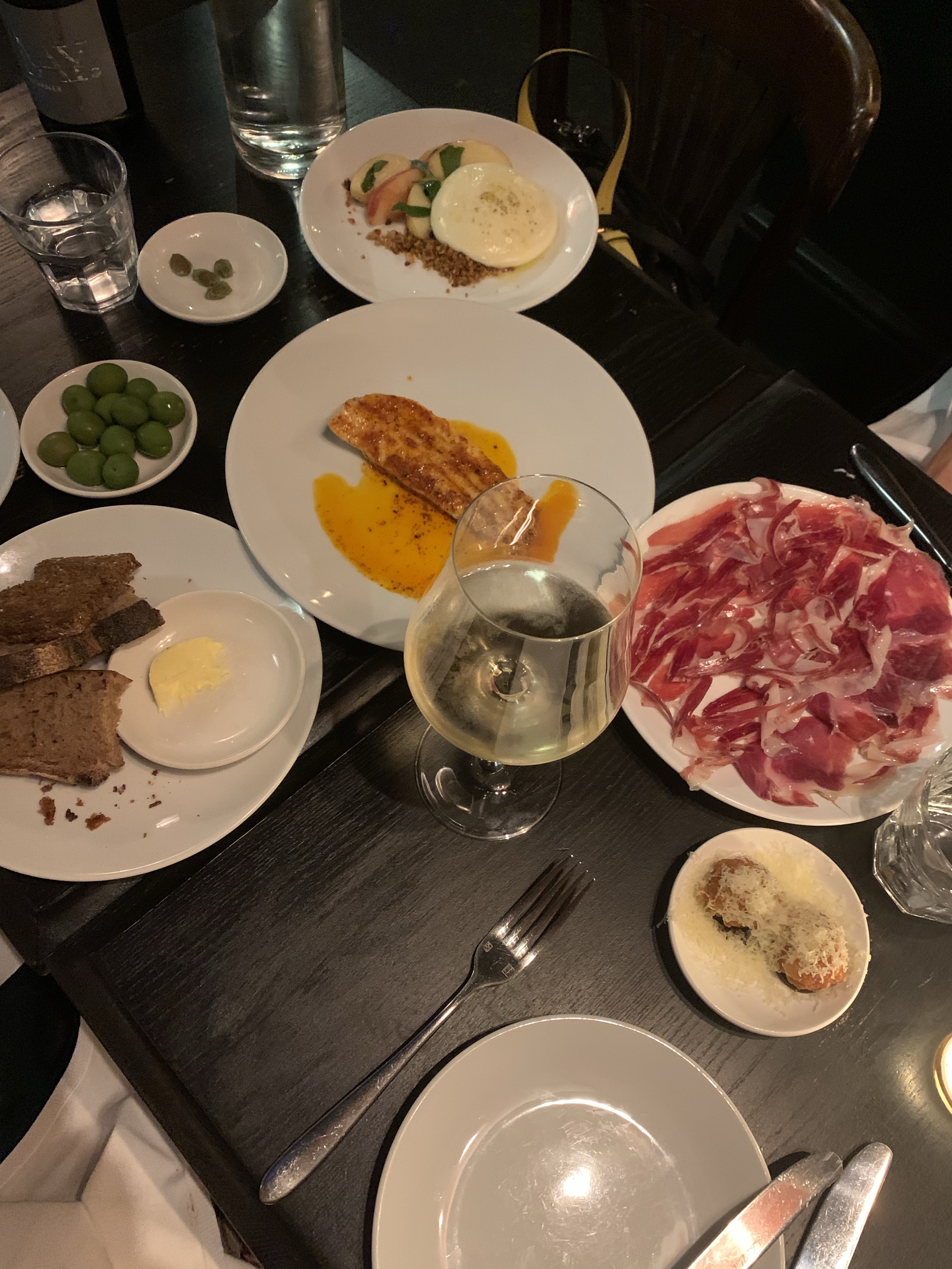 We started with the Bread & Butter (£6), arguably some of the best bread in London. Next came the Comté Beignets with Pickled Walnut Ketchup (£3.50 each), followed by Senorio Iberico Bellota Paleta D.O.P. (£22), and Burrata with Peach. For the mains, we enjoyed Rye with Chili Turbot, Rabbit Leg with Beans and Aioli, and Gnocchi with Goat Cheese Curd, Zucchini, and Summer Truffle. We ended the meal with a decadent Cheese Plate (£16).