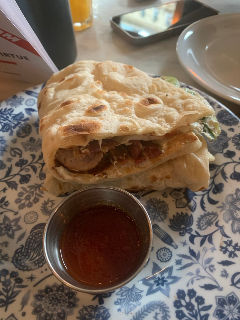 We ordered The Wrestlers Naan Roll (£14.70), packed with smoky streaky bacon, peppery pork sausages, a runny yolk egg, cream cheese, tomato chili jam, and fresh coriander. The roll was absolutely incredible; an imaginative fusion of Indian and British flavors that works perfectly together.
