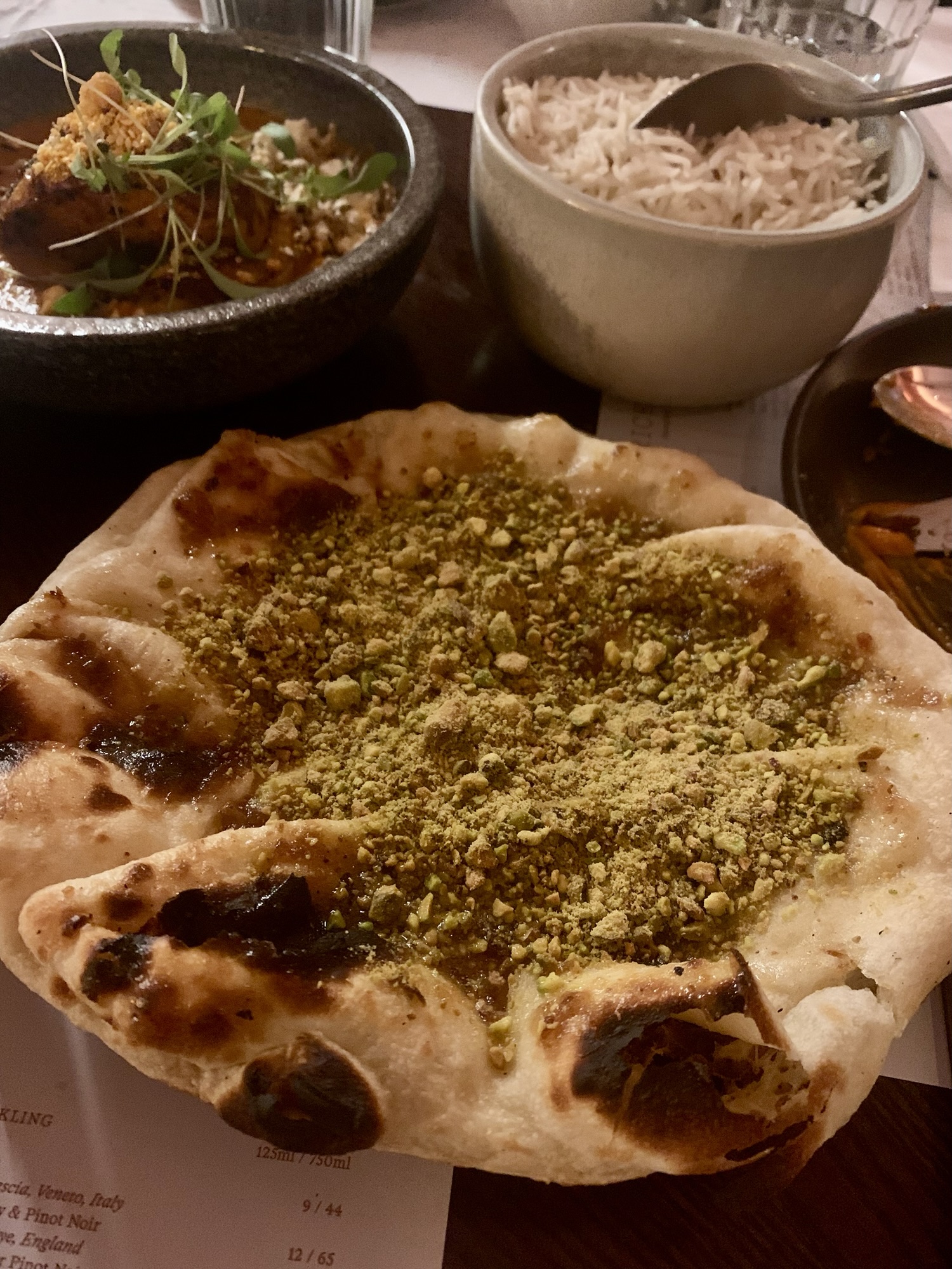 We started with Samphire Pakoras with Tamarind Chutney and Chili Garlic Mayo (£10.50) and Smoked Sweet Potato with Sesame Raita and Gunpowder (£11). For mains, we tried Recheado Butter Prawns with Black Pepper and Gondhoraj (£17), Keralan Fried Chicken with Pickled Mooli and Curry Leaf Mayo (£15), Grilled Squash Makhani with Paneer, Hazelnuts, and Puffed Wild Rice (£15), and Mangalorean Chicken Gassi with Coconut, Curry Leaf, and Gundu Chili (£17). On the side, we had Brown Butter Laccha Paratha (£5), Date and Pistachio Kulcha (£7), and Cucumber and Peanut Raita (£3).