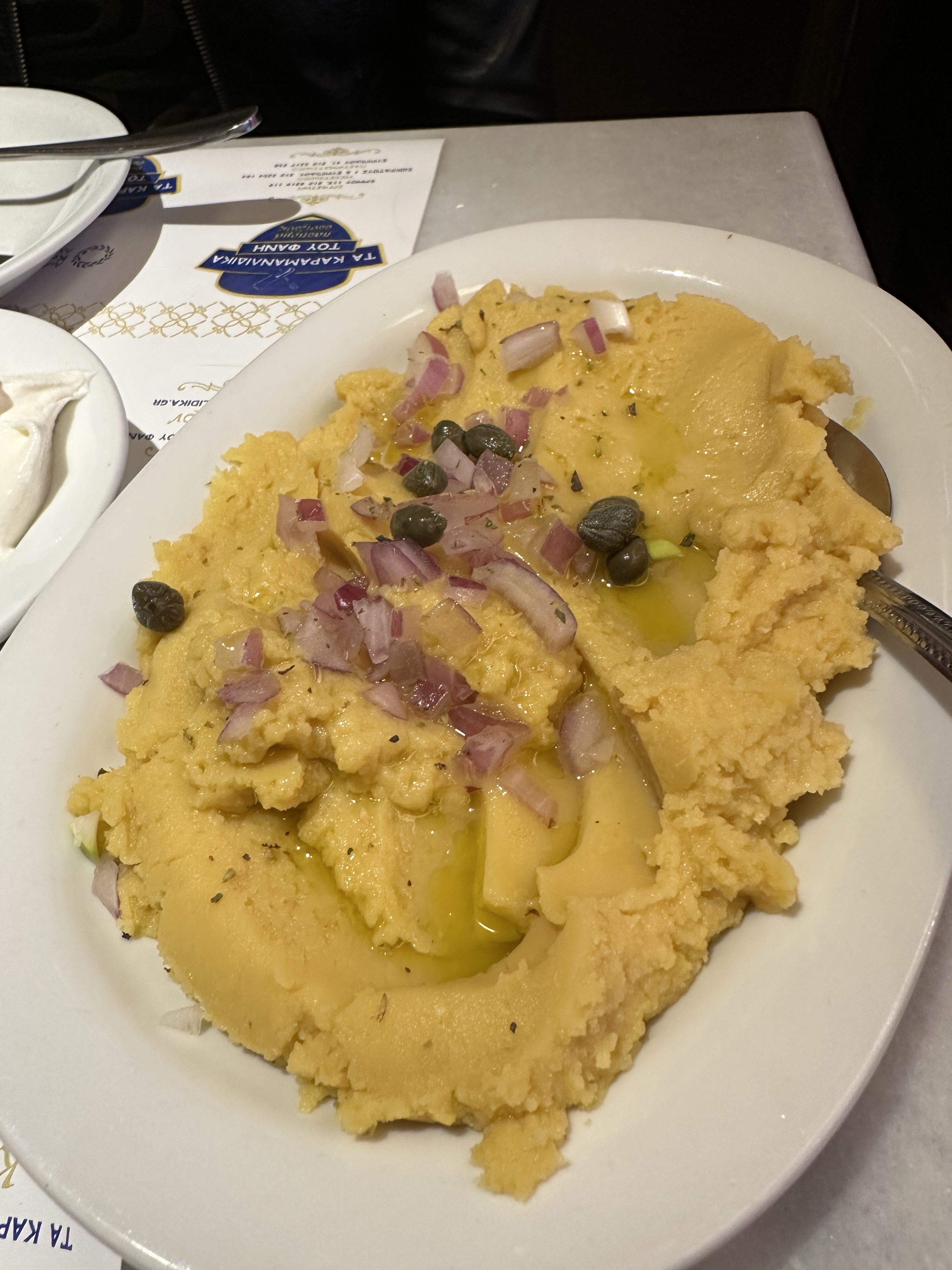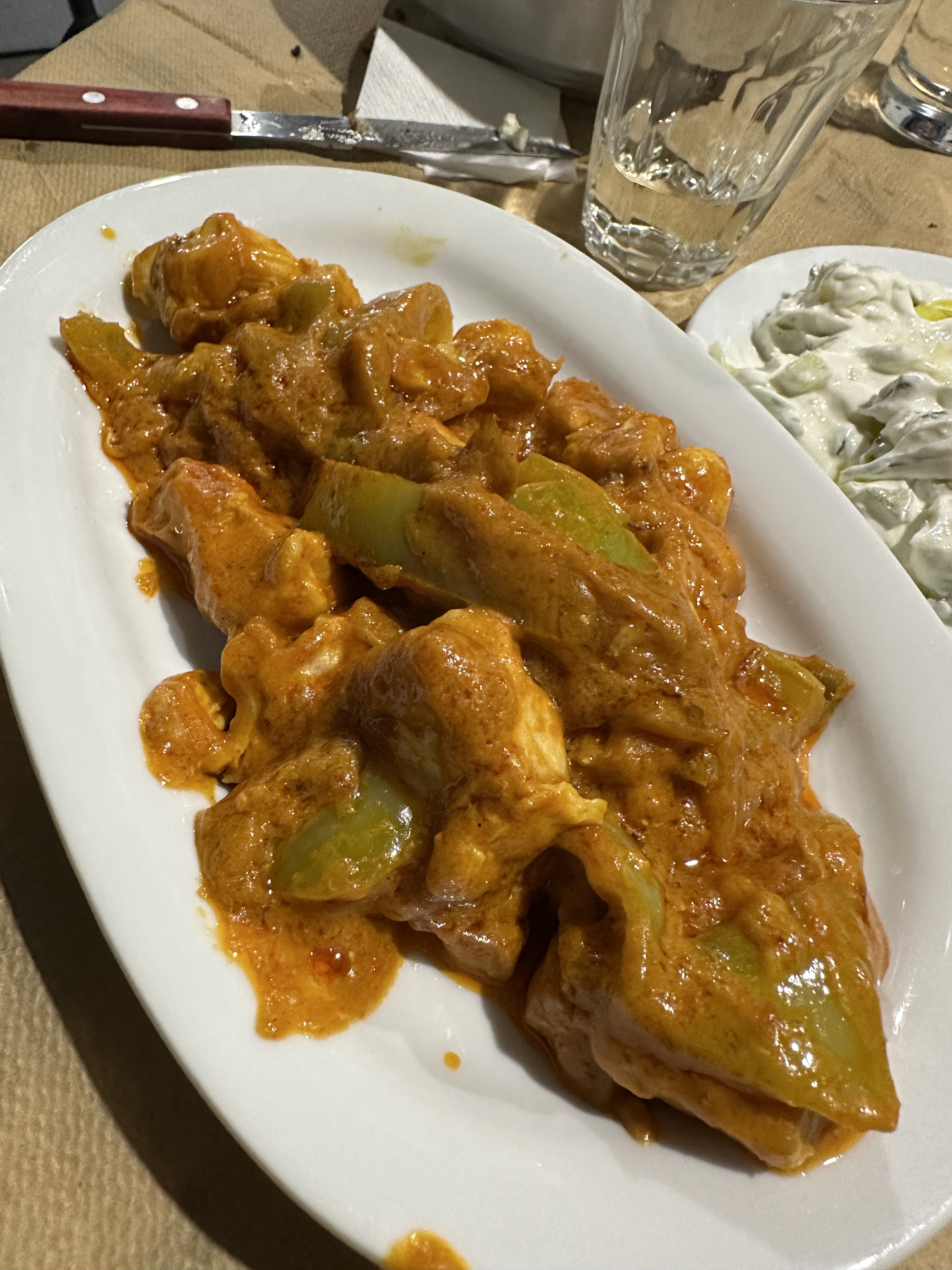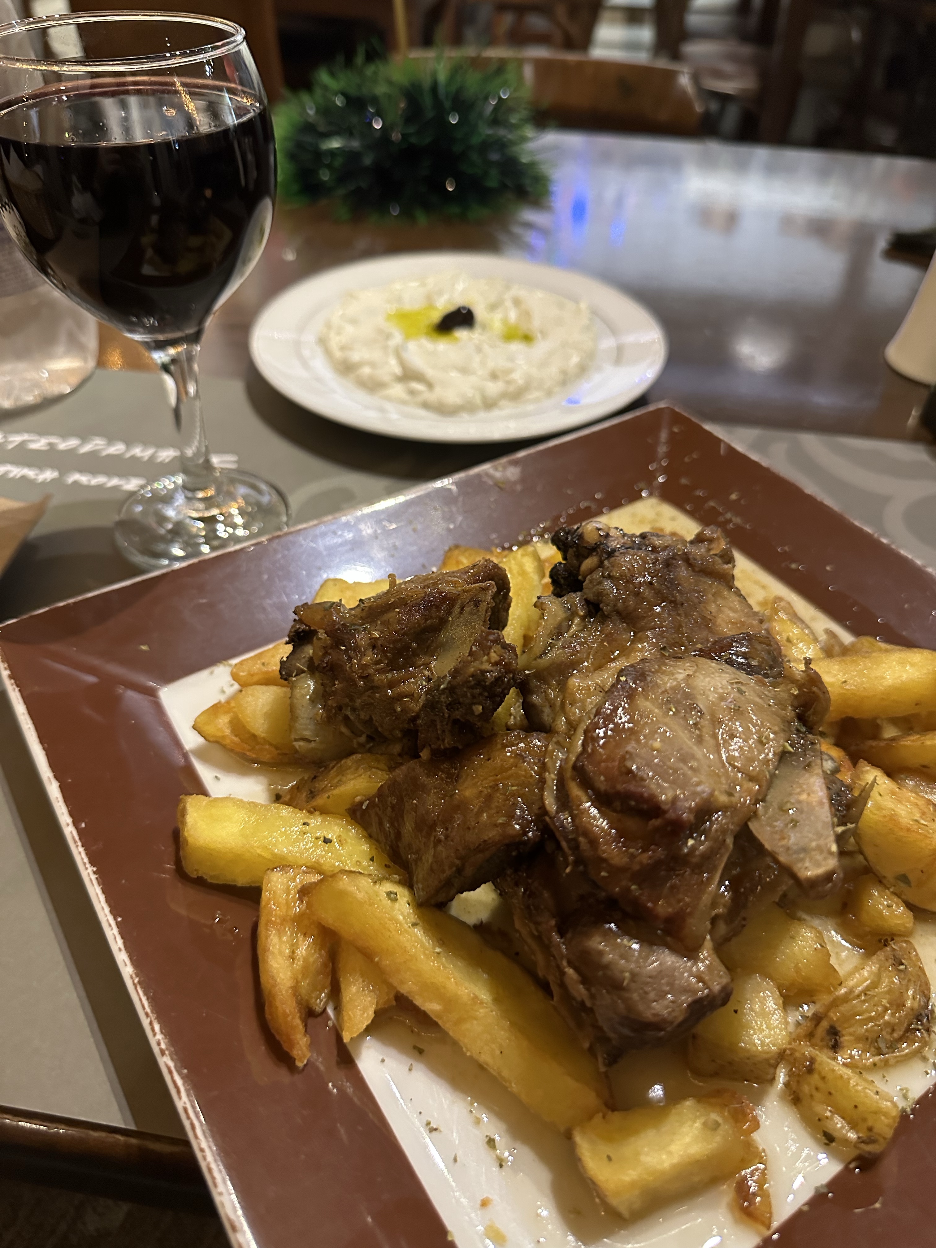 Tucked away inside an actual butcher shop in Athens, this unique restaurant offers a one-of-a-kind dining experience with a twist on traditional Greek cuisine. Specializing in Turkish-Greek fusion dishes, the menu features flavors you won’t easily find in other local tavernas. We started with the delicious stuffed vine leaves (€6) and a smooth, earthy fava bean salad (€4.50). The meatballs (€10) were juicy and well-seasoned, and the pelmeni (€11), a nod to Central Asian dumplings, added an unexpected but delightful touch. To top it off, we were served a complimentary dessert: rich Greek yogurt with sweet carrot marmalade, easily one of the best surprises of the night.