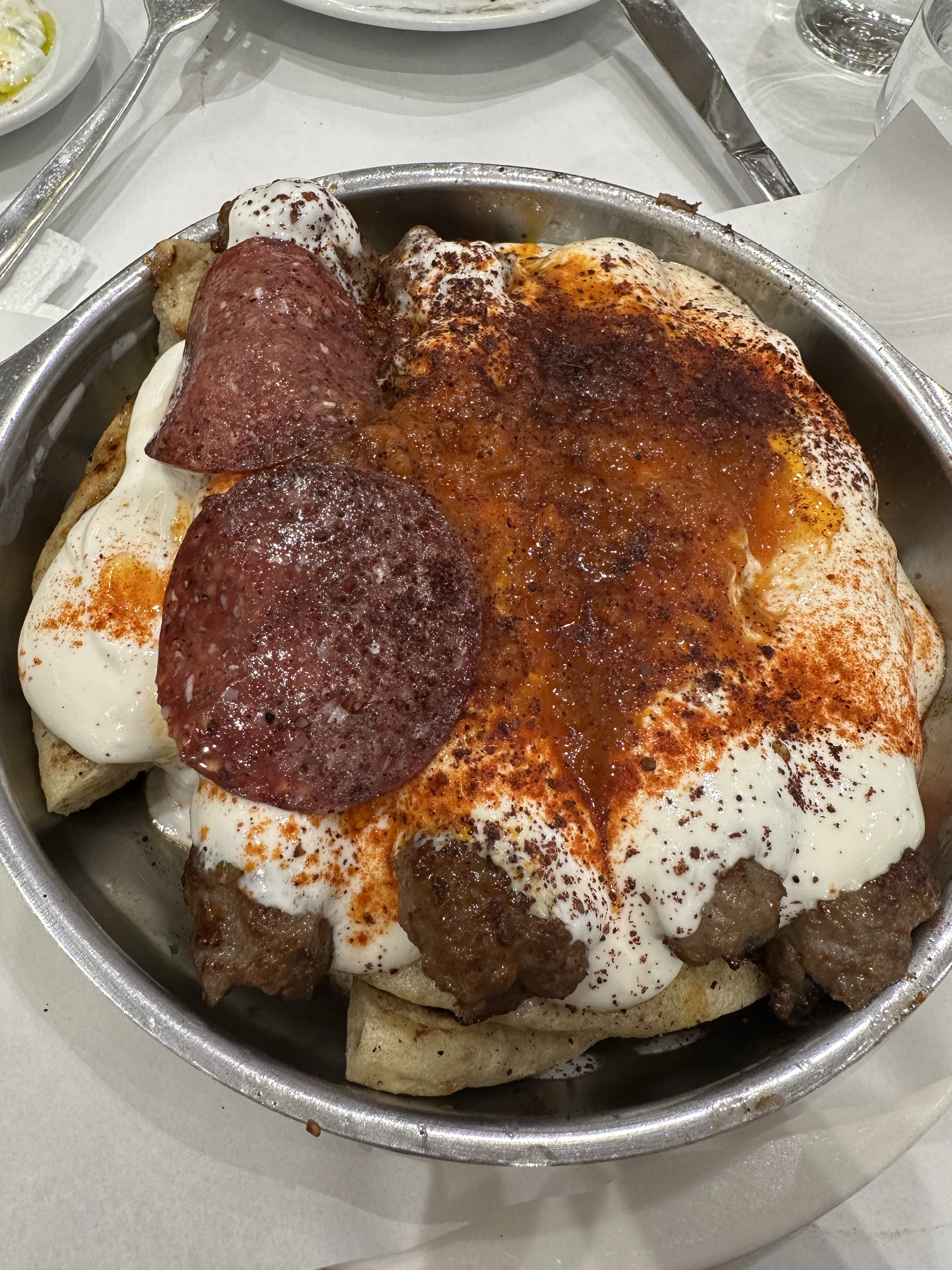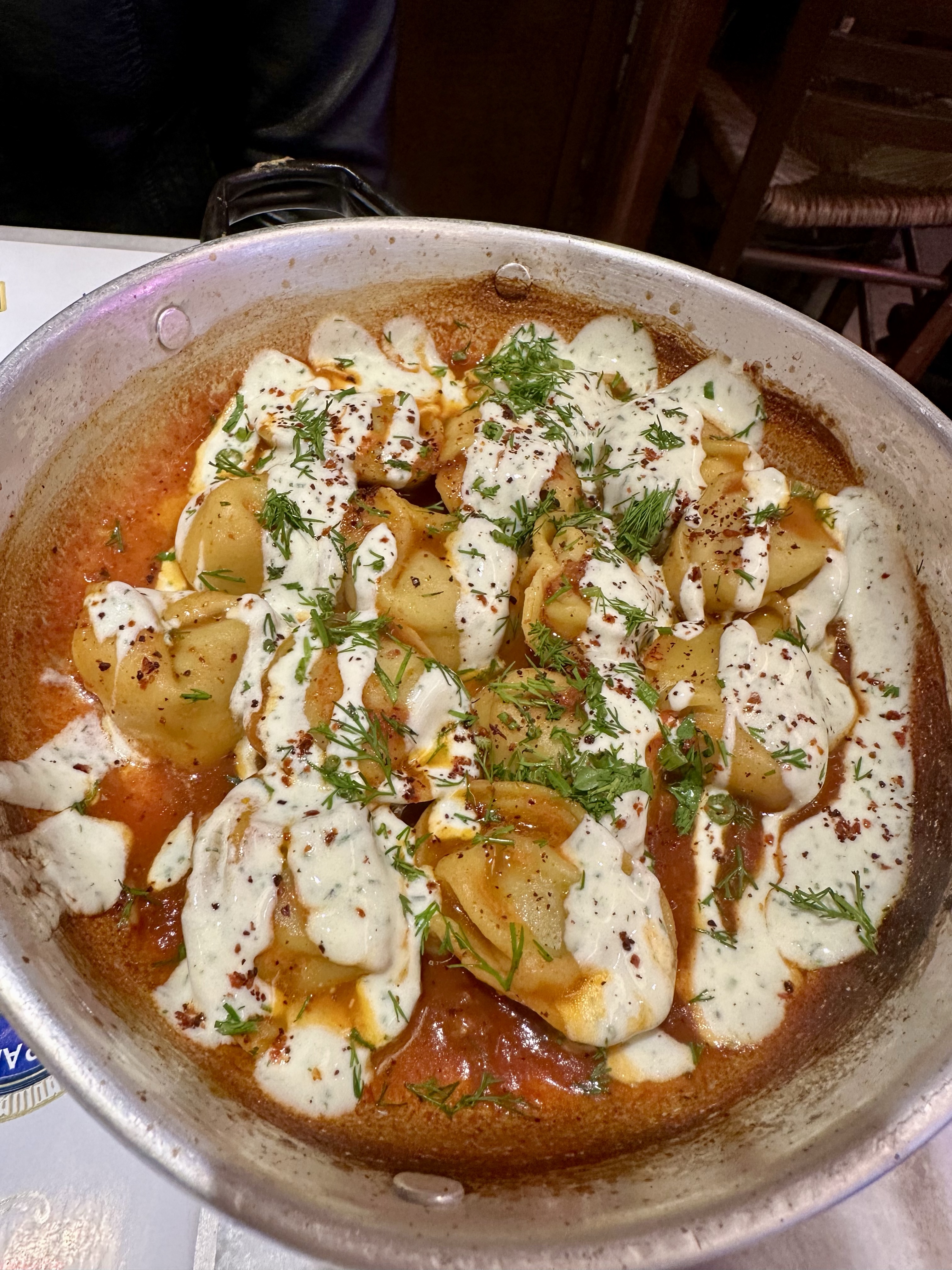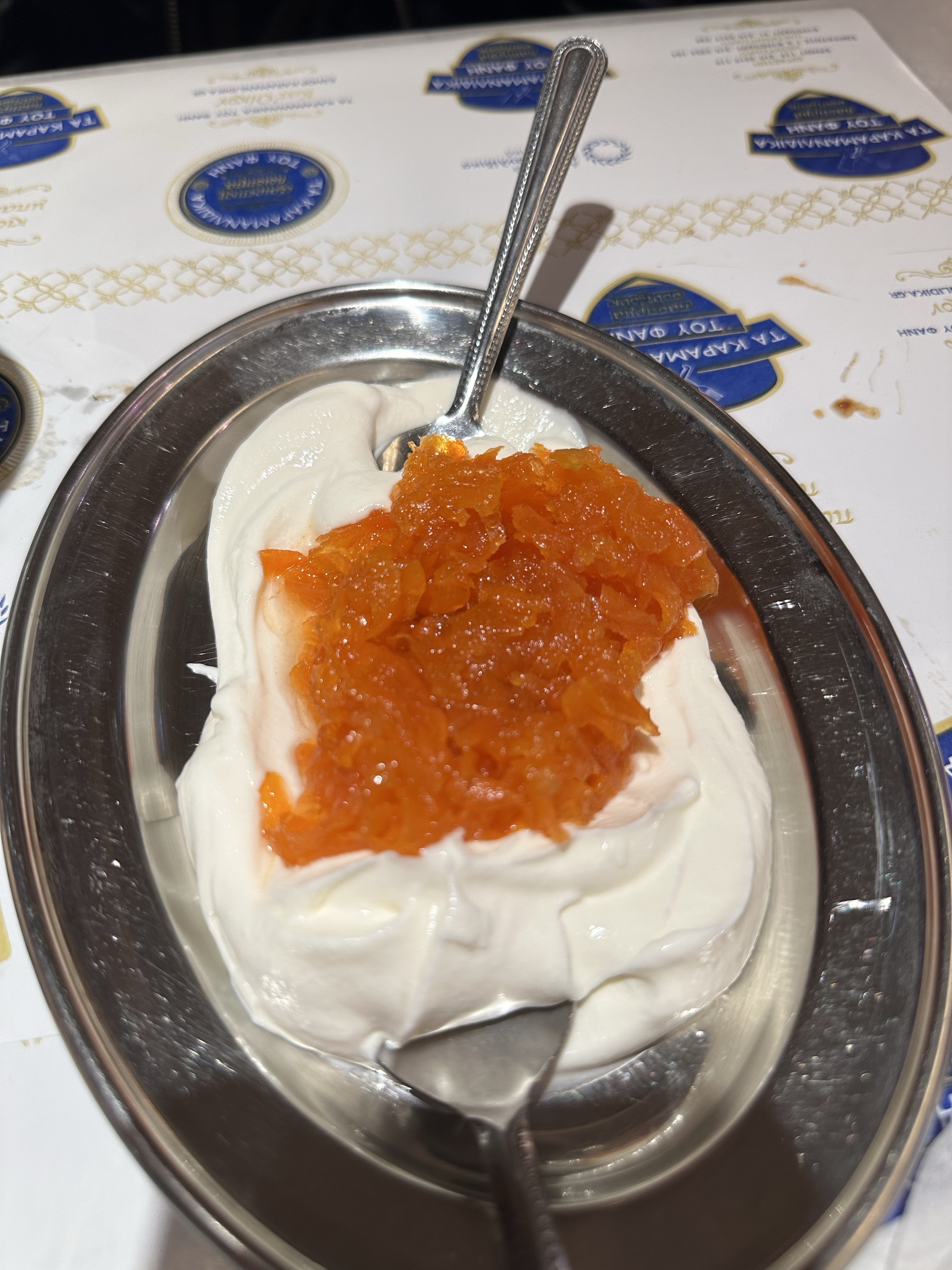 Tucked away inside an actual butcher shop in Athens, this unique restaurant offers a one-of-a-kind dining experience with a twist on traditional Greek cuisine. Specializing in Turkish-Greek fusion dishes, the menu features flavors you won’t easily find in other local tavernas. We started with the delicious stuffed vine leaves (€6) and a smooth, earthy fava bean salad (€4.50). The meatballs (€10) were juicy and well-seasoned, and the pelmeni (€11), a nod to Central Asian dumplings, added an unexpected but delightful touch. To top it off, we were served a complimentary dessert: rich Greek yogurt with sweet carrot marmalade, easily one of the best surprises of the night.