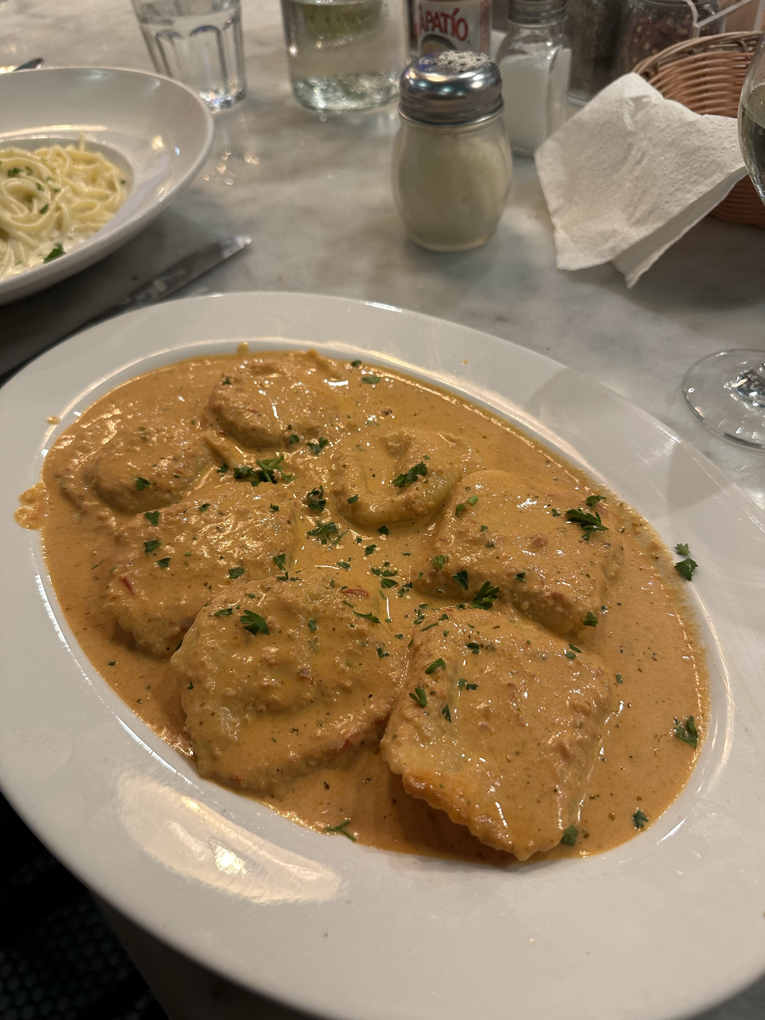 We started with two classics: the Blue Cheese Wedge Salad for $10 and a generous Crab Louie for $37. Both were fresh and well-prepared, with the Crab Louie especially standing out thanks to its sweet crab meat and creamy dressing. For the main course, I ordered the Lobster Ravioli ($28.95), while my vegetarian mom went for the Fettuccine Alfredo ($16). Both dishes were comforting, flavorful, and clearly made with care. The lobster ravioli was rich without being heavy, and the Alfredo sauce was creamy and well balanced.