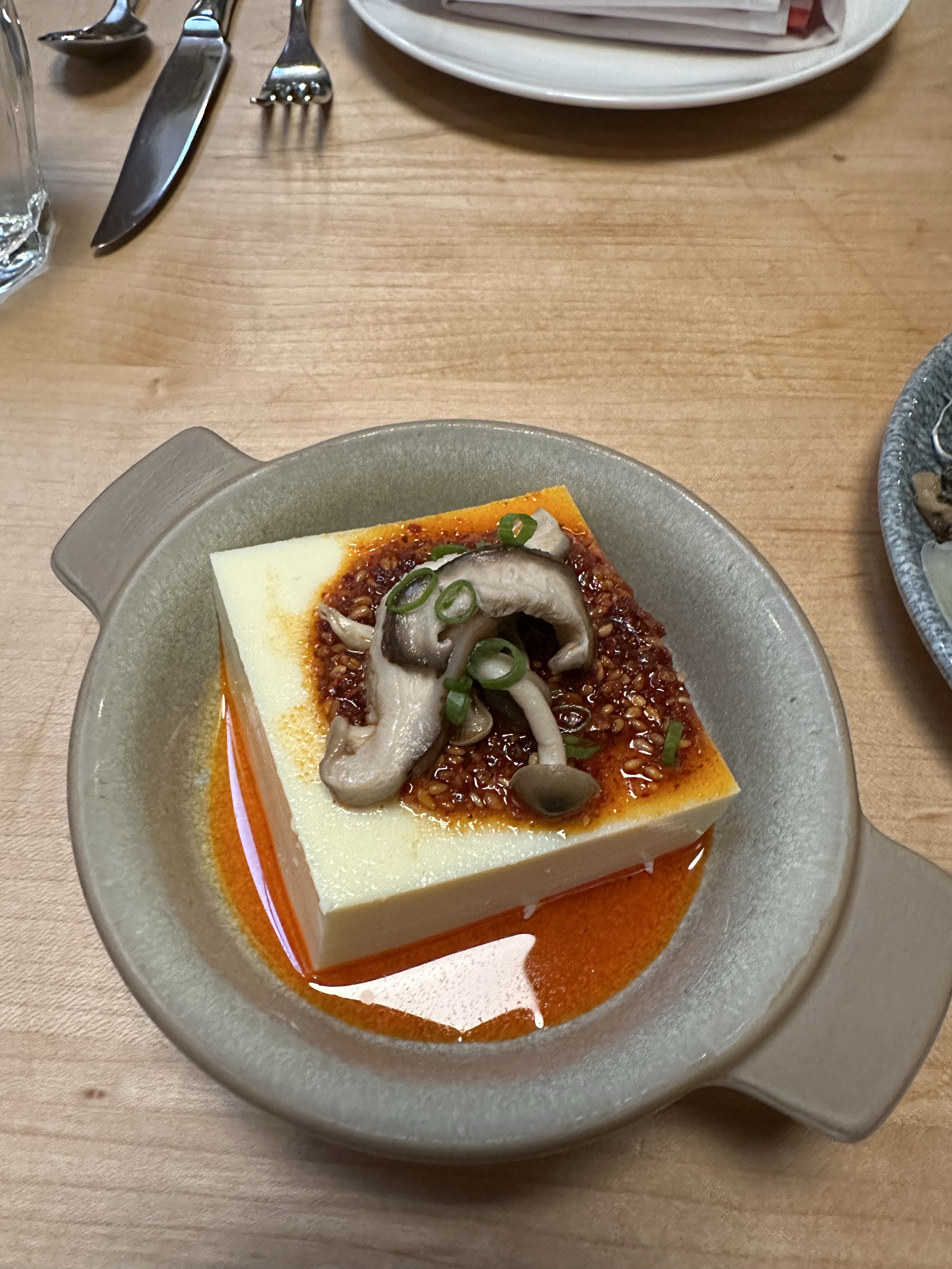 • Steamed egg tofu with pickled honshimeji mushrooms and garlic chili oil ($9) — delicate and beautifully balanced