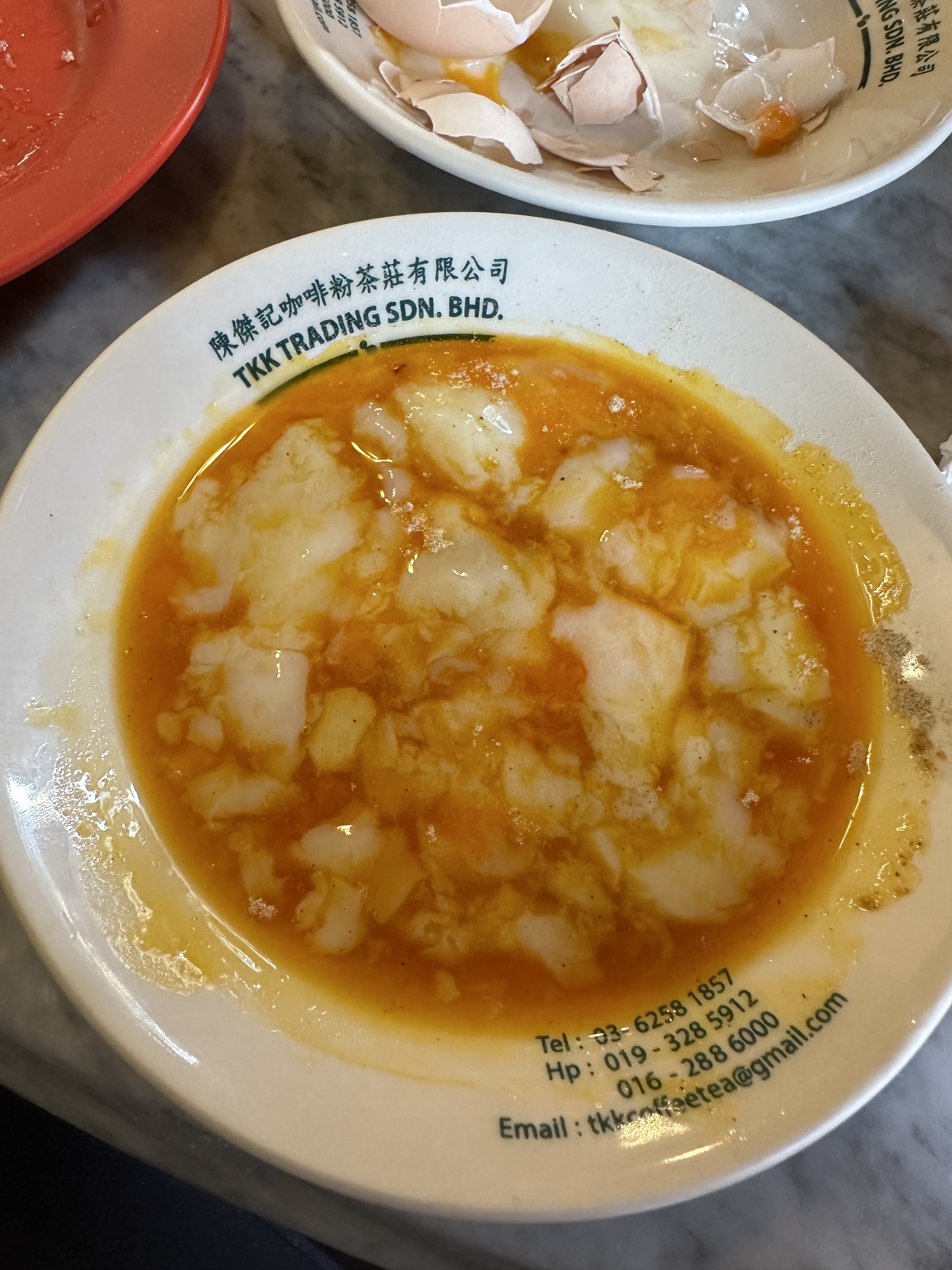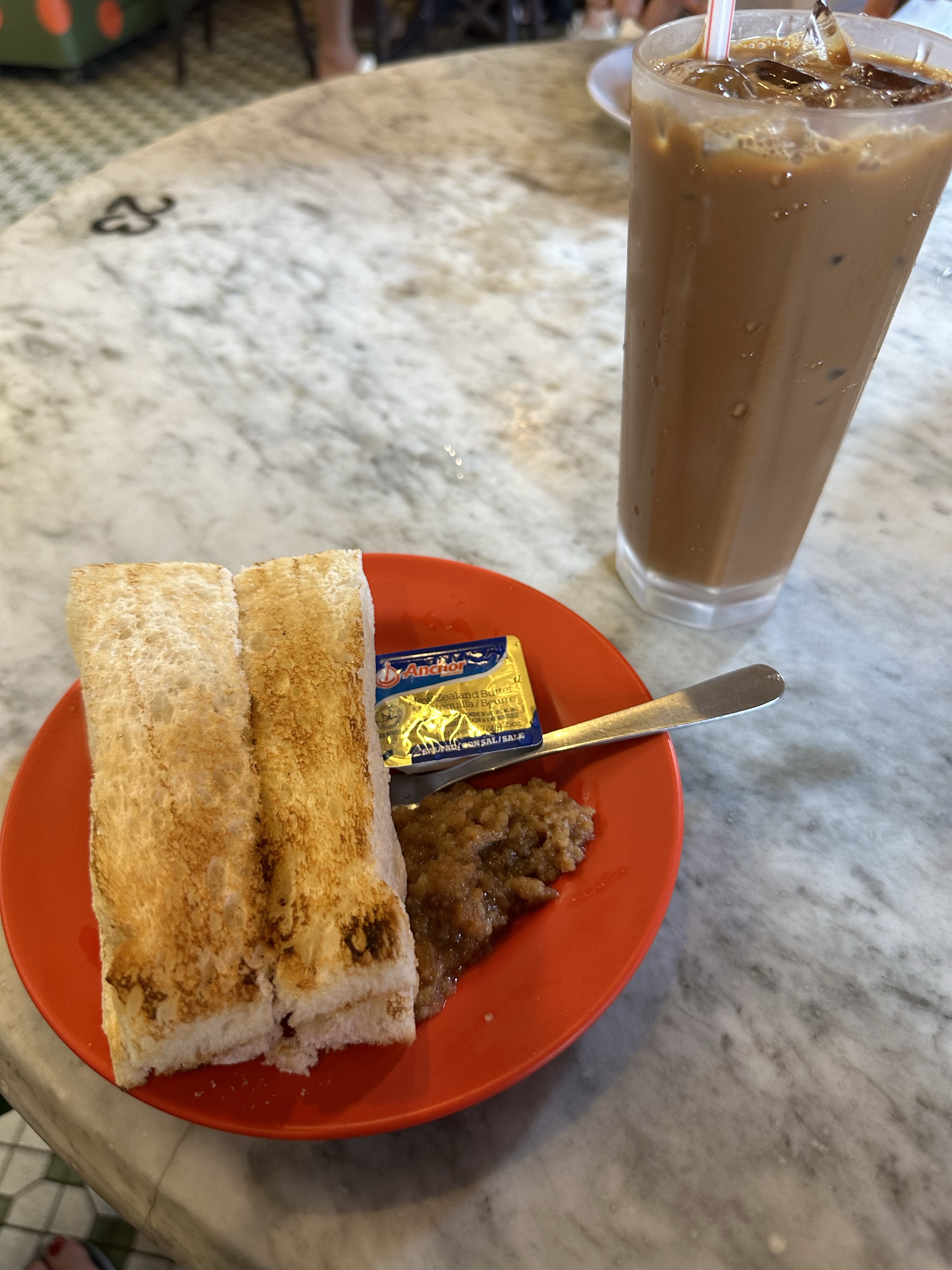On my first visit, I tried the Kaya Toast (5 RM) with a half soft-boiled egg (4 RM) and a cold Kopi (3.45 RM). Kaya is a sweet coconut jam that pairs perfectly with toasted bread. The soft-boiled egg was a new experience for me, but with a dash of white pepper and soy sauce, it was absolutely perfect,a classic Malaysian breakfast combination.