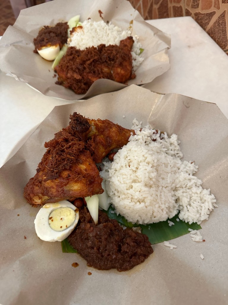 The place was absolutely buzzing, filled with people waiting for takeaway orders and tables alike. Outside, fans with water sprays kept everyone cool while waiting. Thankfully, we got a table quickly and ordered the Nasi Lemak Ayam Goreng (12.50 RM).
